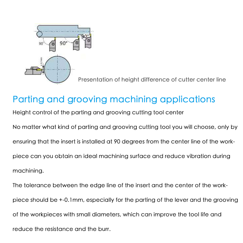 The tolerance between the edge line of the insert and the center of the workpiece should be +-0.1mm, especially for the parting of the lever and the grooving of the workpieces with small diameters, which can improve the tool life and reduce the resistance and the burr.