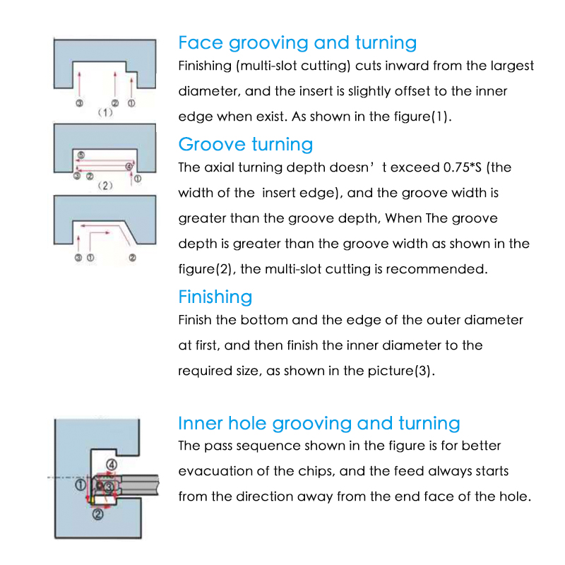 The axial turning depth doesn’t exceed 0.75*S (the width of the insert edge),and the groove width is greater than the groove depth, When The groove depth is greater than the groove width as shown in the figure(2), the multi-slot cutting is recommended.