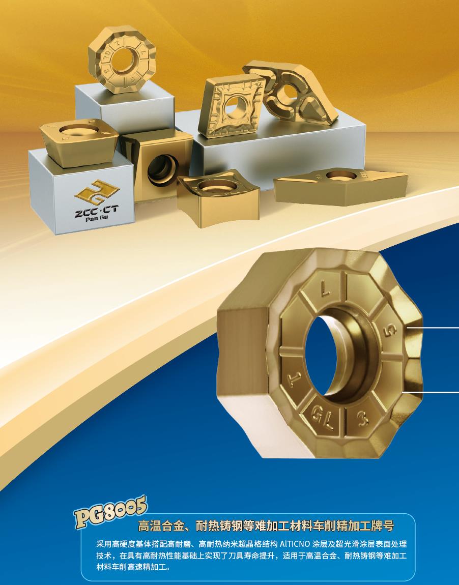 適合難加工材料高效加工的PG8系列數(shù)控刀片牌號:PG8系列牌號采用高硬度基體搭配高耐磨、高耐熱納米超晶格結(jié)構(gòu)涂層以及超光滑涂層表面處理技術(shù),適用于高溫合金、耐熱鑄鋼等難加工材料。PG8005搭配NGF,SNR車削槽型分別用于難加工材料的高效車削精加工。PG8020、8030搭配FMA12、EMP09、FMP17等銑削刀具用于難加工材料的面銑、方肩銑以及仿型銑等加工。