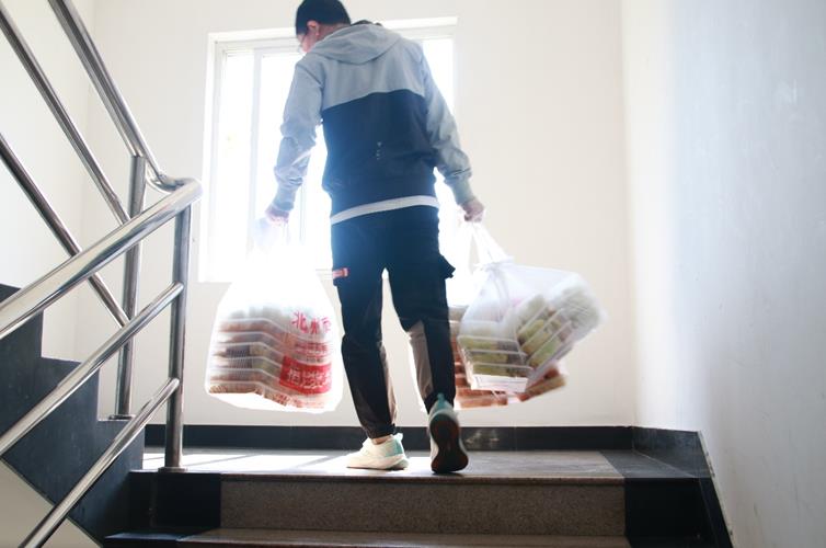 后勤保障組主要負(fù)責(zé)全體人員的餐飲無接觸配送、采購物資的分發(fā)等。每日訂餐結(jié)束后,志愿者從后臺(tái)導(dǎo)出訂餐人員信息,整理出每樓層的總訂餐數(shù)、房間號(hào)及份數(shù)清單,為餐食的分發(fā)提前做好準(zhǔn)備。志愿者取餐后按清單快速分揀各樓層所需餐食,各樓層餐食分配完成后,統(tǒng)一通知開門取餐,極大的減少了員工之間的接觸,大幅提高了配餐的效率,確保員工可以吃上熱乎的午餐和晚餐。目前每日送餐量接近400份,單樓層最大配送量超過80份,經(jīng)過配送流程優(yōu)化后,每層在5-8min即可完成無接觸送餐,效率大大提高。