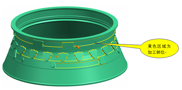 External rough turning of small face——Internal roughturning of large face—— Large face basis Turning ——Rough and finish turning ofsmall face——Internal finish turning of large face ——External ring groovesmilling——External boss profile milling——Face milling of external boss——Externalboss profile clearance milling——Inner-wall ring grooves milling——Milling ofRing grooves on inner-wall for large face(1)——Milling of Ring grooves oninner-wall for large face(2)—— Clearance milling of inner-wall ring groovesprofile for large face——Finish milling of inner-wall T grooves for largeface——Basis finish turning——Large face finish