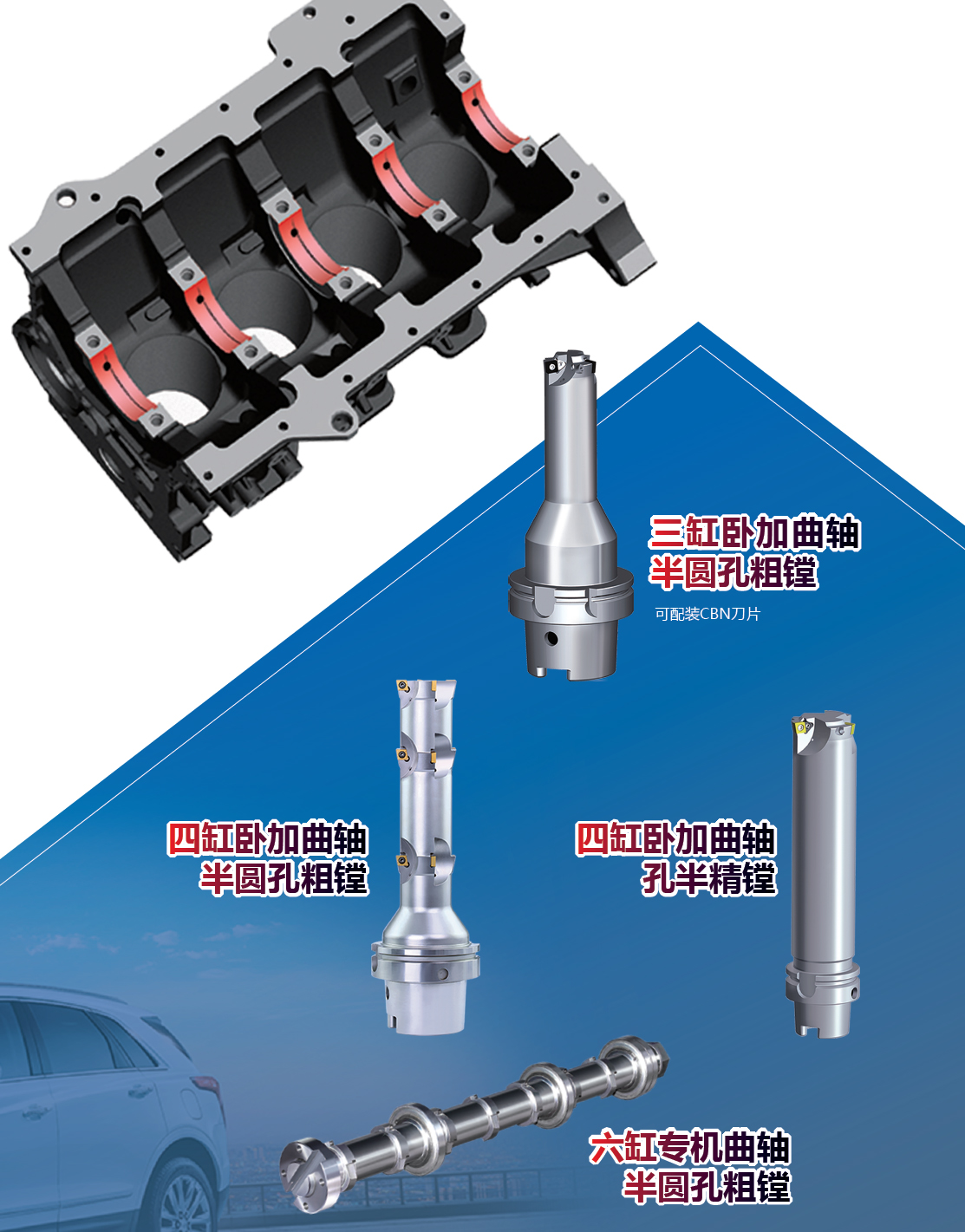 曲軸孔粗銑球頭刀,采用標(biāo)準(zhǔn)系列切削刀片,提供更小的切削功率以及更加精確的擬合精度。